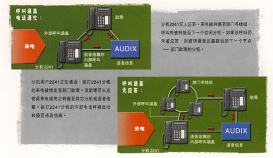 當(dāng)最初的被叫方不能接聽來話時(shí),呼叫涵蓋功能可將來話轉(zhuǎn)接到另外一個(gè)分機(jī)。您可以自行規(guī)定判斷是否轉(zhuǎn)接的標(biāo)準(zhǔn)以及涵蓋通道的條件,如無應(yīng)答、 無此號(hào)碼、遇忙籌。DEFINITY BCS還可以識(shí)別內(nèi)部和外部呼叫,并為其提供不同的涵蓋通道。