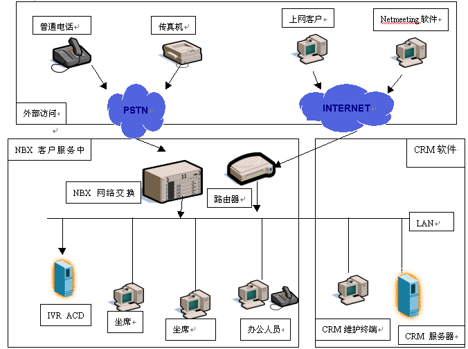 NBX客戶服務中心是基于3Com公司的NBX網(wǎng)絡電話交換機平臺構(gòu)筑的新一代呼叫中心,首先它擴大了服務方式,客戶不但可以通過電話得到服務,還可以在上網(wǎng)訪問企業(yè)主頁的同時使用耳機、麥克風直接與服務代理人員(AGENT)語音通話,一邊瀏覽網(wǎng)頁,一邊交談,增加交流的信息輔助量。還可以通過電子郵件、傳真等方式完成與企業(yè)信息交流,其次NBX客戶服務中心內(nèi)部數(shù)據(jù)、語音兩網(wǎng)合一的布線結(jié)構(gòu),不但提高了呼叫中心的穩(wěn)定性,而且使客戶數(shù)據(jù)能與電話語音同步協(xié)調(diào),完成具有針對性的一對一的客戶服務。