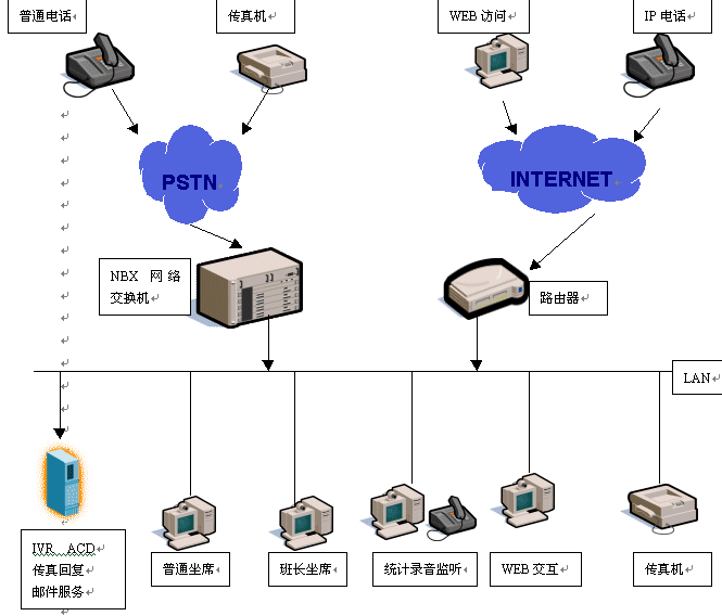 基于NBX 網(wǎng)絡(luò)交換機(jī)的呼叫中心對(duì)外部有PSTN和IP兩種接口,可以接入各種類型用戶:普通電話用戶、傳真用戶、WEB訪問用戶、IP電話用戶。NBX呼叫中心通過NBX網(wǎng)絡(luò)交換機(jī)將外部的PSTN信號(hào)轉(zhuǎn)換為以太網(wǎng)數(shù)據(jù)包信號(hào),在呼叫中心內(nèi)部通過局域網(wǎng)提供話音與數(shù)據(jù)服務(wù)的集成,從而即以開放的局域網(wǎng)包交換技術(shù)實(shí)現(xiàn)專用 PBX的話音服務(wù)功能并與現(xiàn)有局域網(wǎng)無縫集成,從而實(shí)現(xiàn)包括E-mail、傳真、聊天工具、視頻以及話音在內(nèi)的由多種通信媒介的交互。NBX呼叫中心通過統(tǒng)一的ACD將各種通訊方式的訪問協(xié)調(diào)分配,最終實(shí)現(xiàn)了呼叫的中心運(yùn)營(yíng)和諧與高效。