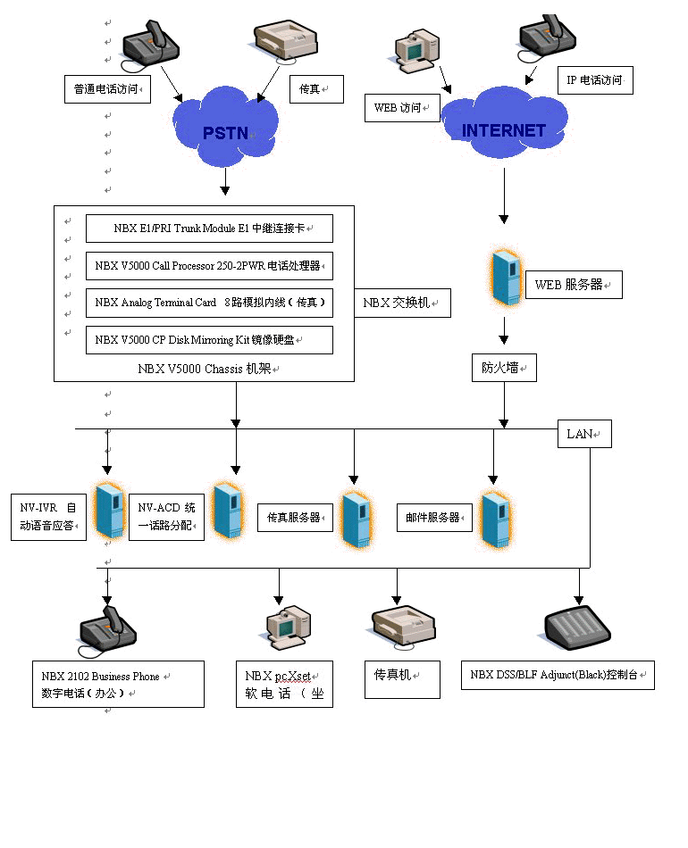 基于NBX的呼叫中心對(duì)外支持PSTN、IP兩種接入方式,可以實(shí)現(xiàn)各種接入:普通電話、傳真、IP電話、郵件、WEB訪問,NBX呼叫中心在技術(shù)上實(shí)現(xiàn)革命性的突破,在內(nèi)部實(shí)行語(yǔ)音數(shù)據(jù)兩網(wǎng)合一,將外部的模擬數(shù)據(jù)轉(zhuǎn)換為以太網(wǎng)數(shù)據(jù)包,由NV-ACD實(shí)現(xiàn)外部各種訪問的統(tǒng)一路由分配。