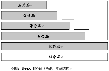 語音應用協(xié)議(VAP VA)也有一個類似于TCP/IP和WAP的層次結構,如下圖(圖四)所示: