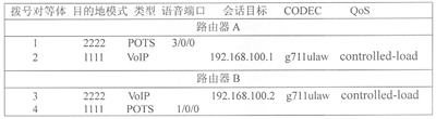 第2部分在清單4中描述,它提供語音連接的實質內容,語音端口簡單地標識它們連接到的設備。撥號對等體1把電話號碼分配給物理語音端口,撥號對等體2定義VoIP呼叫到站點B。在語音端口3/0/0上啟動回聲消除功能。IP優(yōu)先級設置為5,設置資源預留協(xié)議RSVP為controlled-load,確保即使帶寬發(fā)生擁塞與過載時,數(shù)據(jù)流也能得到優(yōu)先處理。而且因為多余的帶寬,語音活動檢測被禁止了,并為撥號點配置了語音編碼速率—64000bps。