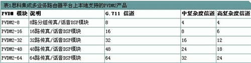 在任意思科集成多業(yè)務路由器平臺主板上使用任意思科PVDM2產(chǎn)品(PVDM2-8,PVDM2-16,PVDM2-24,PVDM2-32或PVDM2-64),可實現(xiàn)內嵌模塊性,無需使用網(wǎng)絡模塊或AIM,即可提供會議、譯碼和話音端接。在思科集成多業(yè)務路由器中安裝思科PVDM2產(chǎn)品,可為IP話音流量和時分多路復用(TDM)流量提供這些服務。使用思科集成多業(yè)務路由器上本地安裝的VIC、VWIC或EVM(EVM僅在Cisco