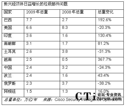 幾個世界經濟領先的國家在2008年和2009年間垃圾郵件量有所降低;然而,發(fā)展中國家的垃圾郵件量呈現上升趨勢。