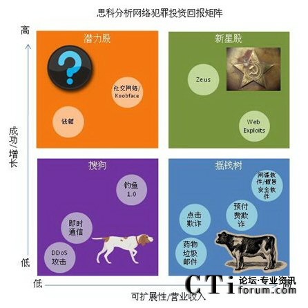 思科網絡犯罪投資回報(CROI)矩陣:今年的《年度安全報告》首次推出了思科CROI矩陣,以波士頓咨詢集團著名的“增長-份額矩陣”為基礎。CROI分析了2010年何種類型的網絡犯罪將為成為“成功者”以及“失敗者”。該矩陣根據2009年的表現,預測大量的銀行業(yè)Trojan