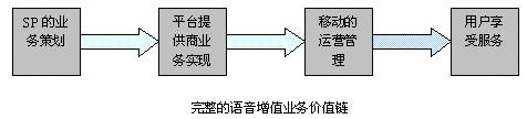在語音雜志業(yè)務運營中,SP、語音平臺提供商、移動公司、移動用戶組成了一條完整的價值鏈,如下圖所示: