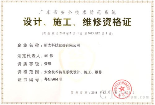 CTI論壇(ctiforum)12月21日消息(記者 張潔):2011年12月,新太科技再傳喜訊,公司順利通過廣東省公安廳認定的“廣東省安全技術(shù)防范系統(tǒng)設(shè)計、施工、維修一級資格證”換證審核,成功獲得新證書。