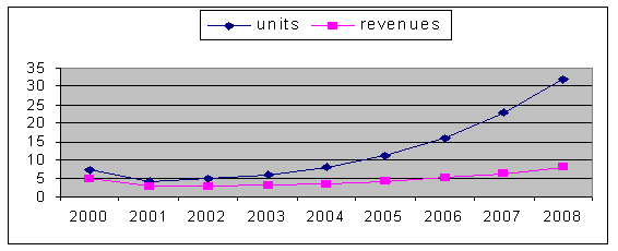 圖2、2000年至2008年全球視頻會議桌面系統(tǒng)市場:數(shù)量與收入預(yù)測