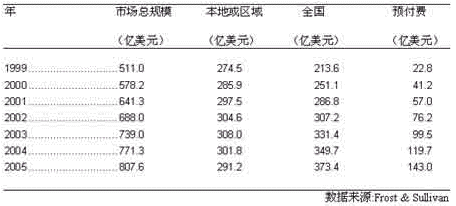 本地或區(qū)域價(jià)格方案在我們預(yù)測(cè)的時(shí)期內(nèi), 將始終是手機(jī)用戶(hù)采納的最多的一種方案。 1999年,在美國(guó)有5千7百 萬(wàn),大約70%的用戶(hù)是采用本地或區(qū)域方案, 而該方案產(chǎn)生的營(yíng)業(yè)額為274.5億美元, 約占市場(chǎng)總規(guī)模的58.6%。Frost & Sullivan 預(yù)計(jì),到2005年, 46.6%的手機(jī)用戶(hù)還會(huì)使用該種方案, 而該方案產(chǎn)生的營(yíng)業(yè)額將為291.2億美元,占市場(chǎng)總規(guī)模的比例將縮至36.1%。