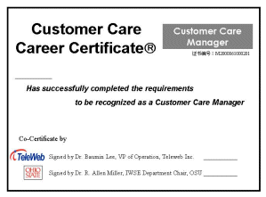 學(xué)員在經(jīng)過(guò)完整的課程培訓(xùn)之后,經(jīng)考試合格,可以獲得由美國(guó)俄亥俄州立大學(xué)與太維資訊有限公司聯(lián)合頒發(fā)的的專業(yè)培訓(xùn)證書(shū)。客戶服務(wù)中心認(rèn)證的目的有兩個(gè):首先,對(duì)于已經(jīng)在客服中心從業(yè)的人員,太維公司的培訓(xùn)可以提供一個(gè)提升他們工作能力的機(jī)會(huì),通過(guò)培訓(xùn)后不同層次的專業(yè)培訓(xùn)認(rèn)證,太維公司以行業(yè)的標(biāo)準(zhǔn)要求對(duì)他們的提升加以證明,以加強(qiáng)他們?cè)谛袠I(yè)中的競(jìng)爭(zhēng)能力。其次,對(duì)于有志致力于在客戶服務(wù)行業(yè)從業(yè)的人事,太維公司廣泛深入、滿足各種需求的專門技術(shù)培訓(xùn)與相應(yīng)的不同層次的認(rèn)證,為他們進(jìn)入該行業(yè)提供一個(gè)標(biāo)準(zhǔn)的素質(zhì)證明,以使他們能夠順利勝任客戶服務(wù)中心的各種主要的工作職位。