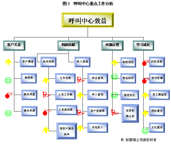 根據(jù)年度重點(diǎn)工作及目標(biāo),我們就可以設(shè)計(jì)關(guān)鍵措施來使其實(shí)現(xiàn)。通常一項(xiàng)關(guān)鍵措施可以有助于幾個(gè)目標(biāo)的達(dá)成。如建立培訓(xùn)體系,可以使得在崗培訓(xùn)、上崗培訓(xùn)、多技能訓(xùn)練以及崗位技能達(dá)標(biāo)率有所提升,而體現(xiàn)在業(yè)務(wù)上的效果則是服務(wù)質(zhì)量的提升、呼出營(yíng)銷收入增加和客戶挽留率提高。