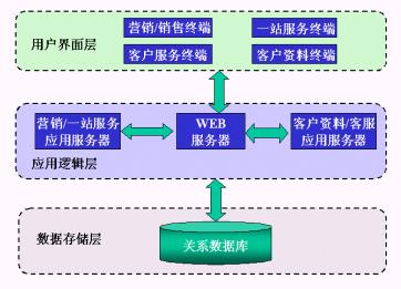 數(shù)據(jù)存儲(chǔ)層中以關(guān)系模型存儲(chǔ)了營(yíng)銷管理、一站服務(wù)、客戶檔案與客戶服務(wù)功能模塊所需的客戶、業(yè)務(wù)數(shù)據(jù);應(yīng)用邏輯層的WEB服務(wù)器向用戶界面層的瀏覽器提供WEB訪問服務(wù),應(yīng)用服務(wù)器上的程序完成實(shí)際的業(yè)務(wù)邏輯,并將需向前臺(tái)返回的結(jié)果從數(shù)據(jù)庫中取出,交給WEB服務(wù)器;而前端的用戶界面層負(fù)責(zé)向用戶展現(xiàn)最終的處理結(jié)果。