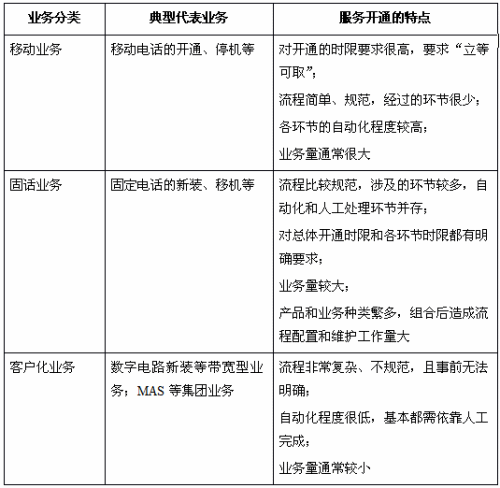 同時全業(yè)務運營也帶來了許多新的服務開通方面的需求。首先,全業(yè)務運營環(huán)境下,運營商為了更快地占領市場和吸引客戶,會推出大量的套餐和捆綁組合產品,這就會引發(fā)流程和環(huán)節(jié)同步的需求,包括多個環(huán)節(jié)同時開始、同時結束、串行等。例如開通一個同時包含固定電話、移動電話的產品包,要求固定電話與移動電話可同時施工、同時竣工。此外,套餐和捆綁組合產品對環(huán)節(jié)級別也存在協(xié)同需求,例如常見的電話與ADSL開通,由于電話與ADSL在技術實現(xiàn)上共用線路,因此這兩個開通流程裝機環(huán)節(jié)需要協(xié)同配合,允許兩個流程同時開始。此外,隨著增值業(yè)務的大量涌現(xiàn),由于增值業(yè)務的數(shù)量眾多,會給維護人員帶來大量的流程配置工作。例如,客戶在申請裝機時可同時申請開通很多增值業(yè)務,不同增值業(yè)務可能由不同的業(yè)務平臺支持,需要到不同的業(yè)務平臺進行施工,裝機流程的配置需支持眾多環(huán)節(jié),且日后會面臨增加新業(yè)務時大量的修改工作量。