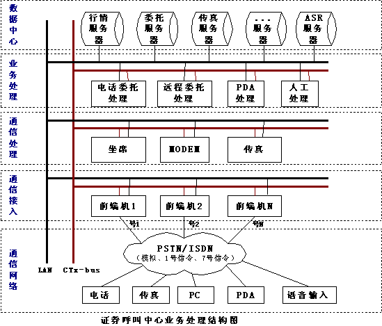 另一種方案是PDA和證券營業(yè)部前端機(jī)(實(shí)際就是電話委托前端機(jī))采用FSK通訊方式,使用電話委托的通道來完成所有的委托查詢。這種方式的速度快,信息容量大,保密性強(qiáng),而且營業(yè)部不需單獨(dú)申請電話線路,PDA和電話委托線路可動(dòng)態(tài)分配,使其電話線路得到最大限度的利用。另外,營業(yè)部對外形象也好,只用一個(gè)號碼就可讓股民完成電話委托、PDA委托等多種委托方式,給股民帶來了方便。不過這種方式需要得到電話語音卡提供廠商的產(chǎn)品技術(shù)支持,語音卡必須同時(shí)支持標(biāo)準(zhǔn)的DTMF和FSK的方式,卡上有充足的能力來處理兩種方式,在語音處理卡的底層驅(qū)動(dòng)應(yīng)該將電話和PDA的委托區(qū)別開來,目前市場能夠完全支持這種應(yīng)用的只有深圳市東進(jìn)通訊技術(shù)股份有限公司的產(chǎn)品,東進(jìn)技術(shù)的新一代PCI系列語音卡數(shù)字卡和模擬卡都完全采用DSP(數(shù)字信號處理器)架構(gòu),卡上有專用DSP來處理DTMF和FSK的收發(fā),是目前PDA委托前端的最好選擇;這種方案還應(yīng)該得到證券電話委托系統(tǒng)的開發(fā)商的支持,在電話委托系統(tǒng)里增加處理PDA委托的功能。目前恒基偉業(yè)的“股靈通”就是采用這種方式。
