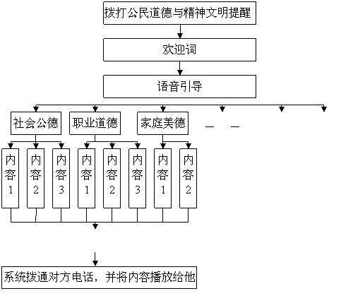 例如,某位公民對他(她)的鄰居或者同事一些不文明的行為(如深夜打麻將,亂倒垃圾,不講衛(wèi)生,破壞公物……)感到有必要進(jìn)行善意的提醒,但是,又覺得直接對他(她)說不合適,因為畢竟雙方很熟悉或者還要共事,如果直接對對方進(jìn)行批評可能會引起對方的反感,即使對方認(rèn)為自己做的不對,也會感到很尷尬,很失面子,在這種情況下,這為公民可以撥打“社區(qū)道德與精神文明提醒熱線”,選取熱線內(nèi)預(yù)先已經(jīng)錄制好,經(jīng)過審定的錄音內(nèi)容,選取內(nèi)容后輸入對方的電話號碼,熱線系統(tǒng)就可以將這段錄音播放給對方聽,對方聽到之后就會意識到或者思考自己的行為里面有沒有不文明的行為,同時會相應(yīng)的約束自己的行為。但是在此過程中對方并不知道為他(她)點播這段錄音的人的電話號碼,從而也不知道是誰給她留的錄音。當(dāng)然,還可以通過電子郵件或者手機短消息的方式對他(她)進(jìn)行提醒。
