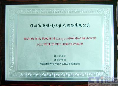 10月23日,中國(guó)國(guó)際通信設(shè)備技術(shù)展覽會(huì)國(guó)際通信展覽會(huì)開(kāi)幕當(dāng)天,由通訊產(chǎn)業(yè)報(bào)社主辦的2007通信產(chǎn)業(yè)方案產(chǎn)品精品評(píng)選活動(dòng)頒獎(jiǎng)典禮隆重舉行,東進(jìn)技術(shù)的“面向業(yè)務(wù)流程的東進(jìn)Seegoe呼叫中心解決方案”榮獲2007最佳呼叫中心解決方案獎(jiǎng)。