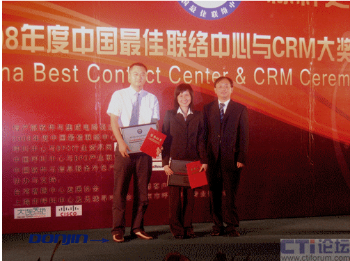 “2008中國最佳聯(lián)絡(luò)中心及CRM評獎”是由中國唯一的國家級呼叫中心與BPO行業(yè)協(xié)會--中國呼叫中心與BPO產(chǎn)業(yè)聯(lián)盟(CNCBA) 與呼叫中心與BPO行業(yè)資訊網(wǎng)(51 Callcenter)、中國軟件與服務(wù)外包產(chǎn)業(yè)聯(lián)盟共同主辦,代表中國唯一接軌全球最佳聯(lián)絡(luò)中心評選標(biāo)準(zhǔn),是工業(yè)和信息化部唯一認(rèn)可的行業(yè)獎項,為真正意義上的中國聯(lián)絡(luò)中心“奧斯卡”獎。參選對象為中國行政區(qū)域內(nèi)的各類政府、企事業(yè)單位聯(lián)絡(luò)中心、客戶服務(wù)中心、客戶支持中心、客戶聯(lián)絡(luò)中心、以及同類含義的職能部門及其從業(yè)人員等。因此,無論是從獎項的規(guī)格還是入選的圍度都是非常高規(guī)格與嚴(yán)格的。東進(jìn)技術(shù)的多媒體呼叫中心系統(tǒng)平臺解決方案在此次評選中經(jīng)過了用戶、業(yè)界同仁與專家學(xué)者的一致認(rèn)可,最終獲得了這一殊榮。