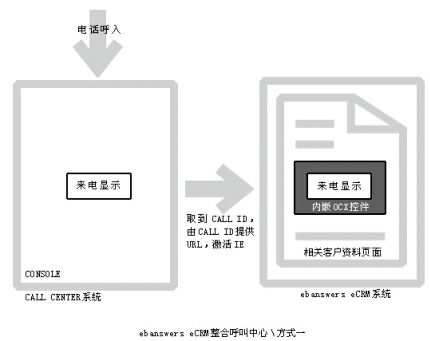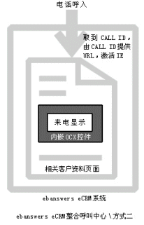 。。Ebanswers CRM整合呼叫中心的這種方式過程更清晰,當有電話呼入系統(tǒng)時,由內(nèi)嵌的OCX控件取到call