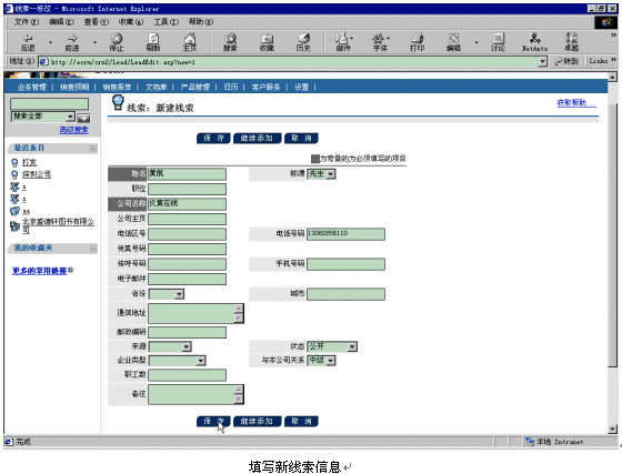 。。比如現(xiàn)在有一個新客戶黃航的電話13082856110呼入Ebanswers呼叫中心,console控制臺接收到這個電話號碼以后,會產(chǎn)生一個URL鏈接地址tel=217,以參數(shù)的形式附在調(diào)用的CRM頁面http://ecrm/crm2/default.asp?retURL=http://ecrm/crm2/search/searchtel_xml.asp后面,當話務員登錄以后,就會彈出相應的添加新線索頁面,話務員填寫好相關(guān)信息后,按下"保存"按鈕就可以建立新線索了。