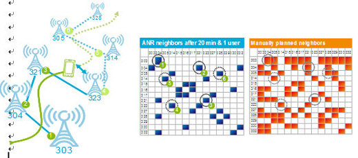 ANR盡管目前在LTE還沒有商用,但在多個歐美運營商的測試中,愛立信產(chǎn)品表現(xiàn)良好。如下圖ANR測試中,僅使用一個移動終端在20分鐘內(nèi)通過了20個基站覆蓋區(qū)域,檢測到的鄰區(qū)關(guān)系如藍(lán)圖所示,相比橙色圖的手工配置鄰區(qū),所有必要的鄰區(qū)關(guān)系(有數(shù)字標(biāo)示)悉數(shù)獲得。而且這僅僅動用了一個終端,如果相關(guān)區(qū)域內(nèi)都有終端分布,檢測的速度會有極大提高。