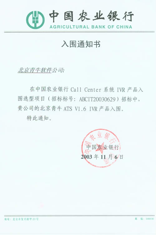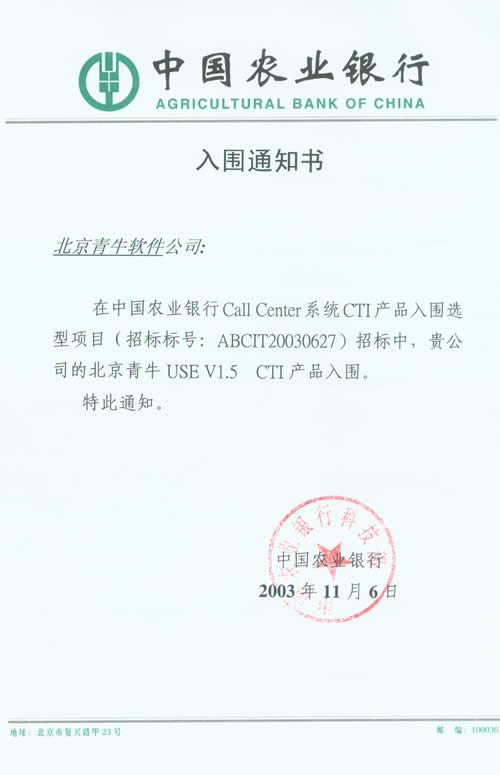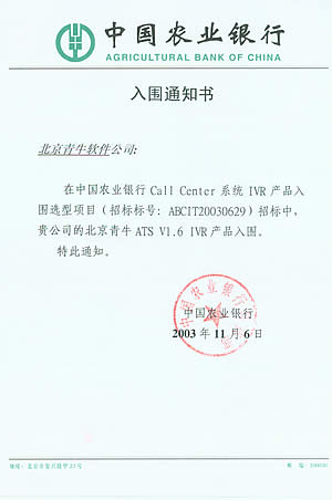 北京青牛軟件技術有限責任公司憑借多年來深厚的技術基礎、完善的咨詢服務和優(yōu)異的產(chǎn)品表現(xiàn),在本次CTI產(chǎn)品、IVR產(chǎn)品入圍選型項目中脫穎而出。青牛軟件此次入圍中國農業(yè)銀行總行Call