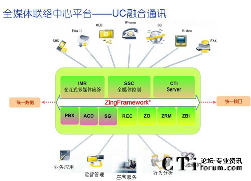 英立訊公司ZingFramework®®全媒體聯(lián)絡(luò)中心平臺基于H.323和SIP等國際標(biāo)準(zhǔn)協(xié)議,通過SOA服務(wù)架構(gòu)實(shí)現(xiàn)聯(lián)絡(luò)中心的優(yōu)化計(jì)算,為客戶應(yīng)用提供了多媒體服務(wù)處理能力,支持固話、手機(jī)、傳真、郵件、短信、互聯(lián)網(wǎng)和Web電話等多種通信方式的接入,以及3G視頻互動和RFID物聯(lián)應(yīng)用,實(shí)現(xiàn)多種服務(wù)媒體和通訊渠道的統(tǒng)一融合,并提供統(tǒng)一接入、統(tǒng)一路由、統(tǒng)一排隊(duì)、統(tǒng)一服務(wù)、統(tǒng)一處理和回復(fù)的的綜合融合通訊服務(wù)平臺。
