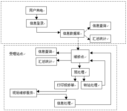 維修點對用戶的報修情況進行預(yù)處理之后,根據(jù)用戶所在的區(qū)域,分配至最近距離的維修站,將用戶與其報修信息即時轉(zhuǎn)移,這也就是圖中所顯示的"轉(zhuǎn)站處理"。之后,維修站將直接打印出報修單,加快服務(wù)實施的效率、減少人工出錯的比例,有專業(yè)人員及時上門服務(wù)檢修。