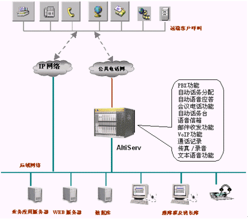 該系統(tǒng)包括 ALTISERVE®、IVR、 自動(dòng)傳真、 智能選擇坐席ACD、 來(lái)電號(hào)碼的顯示、監(jiān)督系統(tǒng)、客戶資料的查詢與錄入、查詢統(tǒng)計(jì)、現(xiàn)有資源的集成、開(kāi)放的