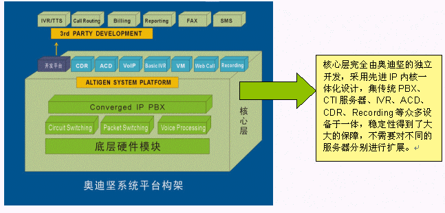 交換功能作為整個系統(tǒng)的核心功能,是系統(tǒng)一切功能的基礎。奧迪堅高度一體化通訊服務器AltiServ,采用先進的DSP等技術,將傳統(tǒng)的語音交換和IP包交換在系統(tǒng)底層實現(xiàn),使系統(tǒng)的技術水平、功能及穩(wěn)定性達到了一個新的高度,可以實現(xiàn)大容量電話的呼入/呼出處理、電話轉(zhuǎn)接、支持PRI、E1、中國一號信令、七號信令、模擬線路等多種接入方式,同時還具備傳統(tǒng)PBX所不具備的強大的語音信箱、電話會議功能、VoIP、界面友好的系統(tǒng)管理功能等。由于在底層對VoIP支持,所以既可以使用普通電話機,也可以使用IP話機或者軟電話登陸到系統(tǒng),豐富了用戶的選擇的范圍,方便了用戶使用并節(jié)省投資,并且VoIP技術擴展了增值空間,可以用IP座席輕松構(gòu)建遠程專家座席,更加適合互聯(lián)網(wǎng)時代的應用。