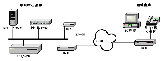 用戶通過(guò)連接在RAM的電話撥號(hào)向總部發(fā)出連接請(qǐng)求,通過(guò)專(zhuān)用線或PSTN網(wǎng),與呼叫中心總部的PBX和網(wǎng)絡(luò)聯(lián)接,(當(dāng)然也要通過(guò)一個(gè)RAM接口服務(wù)器器)。