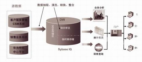 利用Sybase IQ的產(chǎn)品優(yōu)勢(shì),我們將客戶服務(wù)管理系統(tǒng)、銷售業(yè)務(wù)系統(tǒng)、華為呼叫中心平臺(tái)的各種異構(gòu)數(shù)據(jù)庫數(shù)據(jù),通過 IQ 提供的直接數(shù)據(jù)訪問方式,逐步實(shí)施對(duì)數(shù)據(jù)的抽取、轉(zhuǎn)換及加載(ETL),最終整合到