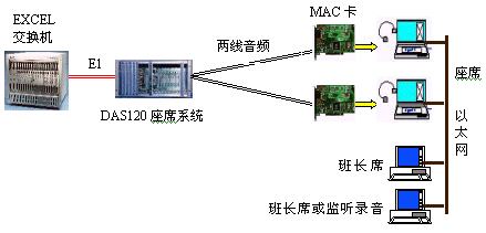 因?yàn)镋XCEL交換機(jī)不能提供模擬接口。DAS120的出現(xiàn)很好地彌補(bǔ)了其不足。它與EXCEL交換機(jī)采用4個(gè)E1連接,可以簡(jiǎn)潔實(shí)現(xiàn)PCM信號(hào)轉(zhuǎn)模擬信號(hào)引出到座席。E1接口的信令可選配為隨路信令CAS和透明通道Clear