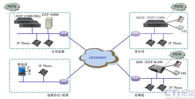 在公司總部采用EICP-S2000或EICP-C1000作為整個(gè)系統(tǒng)的核心服務(wù)器/控制器,并與PSTN電信網(wǎng)對接;在分公司、辦事處可采用SAG32、SAG8、C1000、Rc100作為集團(tuán)電話,也可直接采用IP話機(jī)作為桌面辦公電話。公司員工不管用那種電話,不管在什么地方,都可享用EICP系統(tǒng)帶來的高效、便捷服務(wù)。
