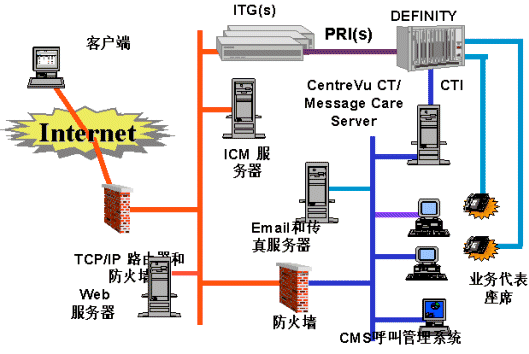 Internet呼叫中心(Internet Call Center簡(jiǎn)稱ICC)是當(dāng)前的一個(gè)明顯趨勢(shì)。支持因特網(wǎng)作為呼叫中心的訪問(wèn)渠道會(huì)極大增強(qiáng)呼叫中心的可用性。Internet用戶可以通過(guò)主頁(yè)瀏覽、電子郵件、在線Chat、IP語(yǔ)音電話等方式與話務(wù)員建立在線聯(lián)系,得到優(yōu)質(zhì)的服務(wù)。AVAYA的Internet呼叫中心解決方案支持用戶采用一條電話線進(jìn)行因特網(wǎng)和IP電話的訪問(wèn),ICM管理器與Web服務(wù)器建立連接,將到來(lái)的IP呼叫進(jìn)行自動(dòng)分配,ITG IP電話網(wǎng)關(guān)實(shí)現(xiàn)將IP語(yǔ)音流轉(zhuǎn)換成語(yǔ)音信號(hào),經(jīng)E1線送到Definity交換機(jī)后傳到話務(wù)員座席。座席和用戶可實(shí)現(xiàn)瀏覽器同步等功能。