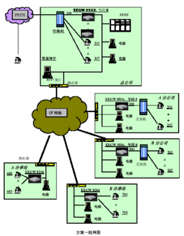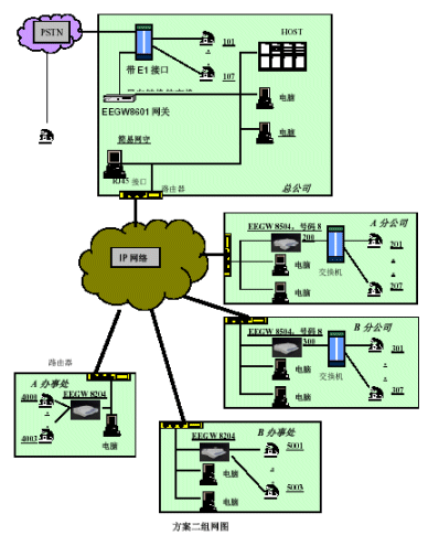 。。本方案有主要配置:總公司配備3臺(tái)EEGW8504FXO網(wǎng)關(guān)、四個(gè)分公司分別配備1臺(tái)EEGW8504FXO網(wǎng)關(guān),四個(gè)辦事處分別配備1臺(tái)EEGW8204FXO網(wǎng)關(guān)。在總公司出可以安裝EEGK8001簡(jiǎn)易網(wǎng)閘。