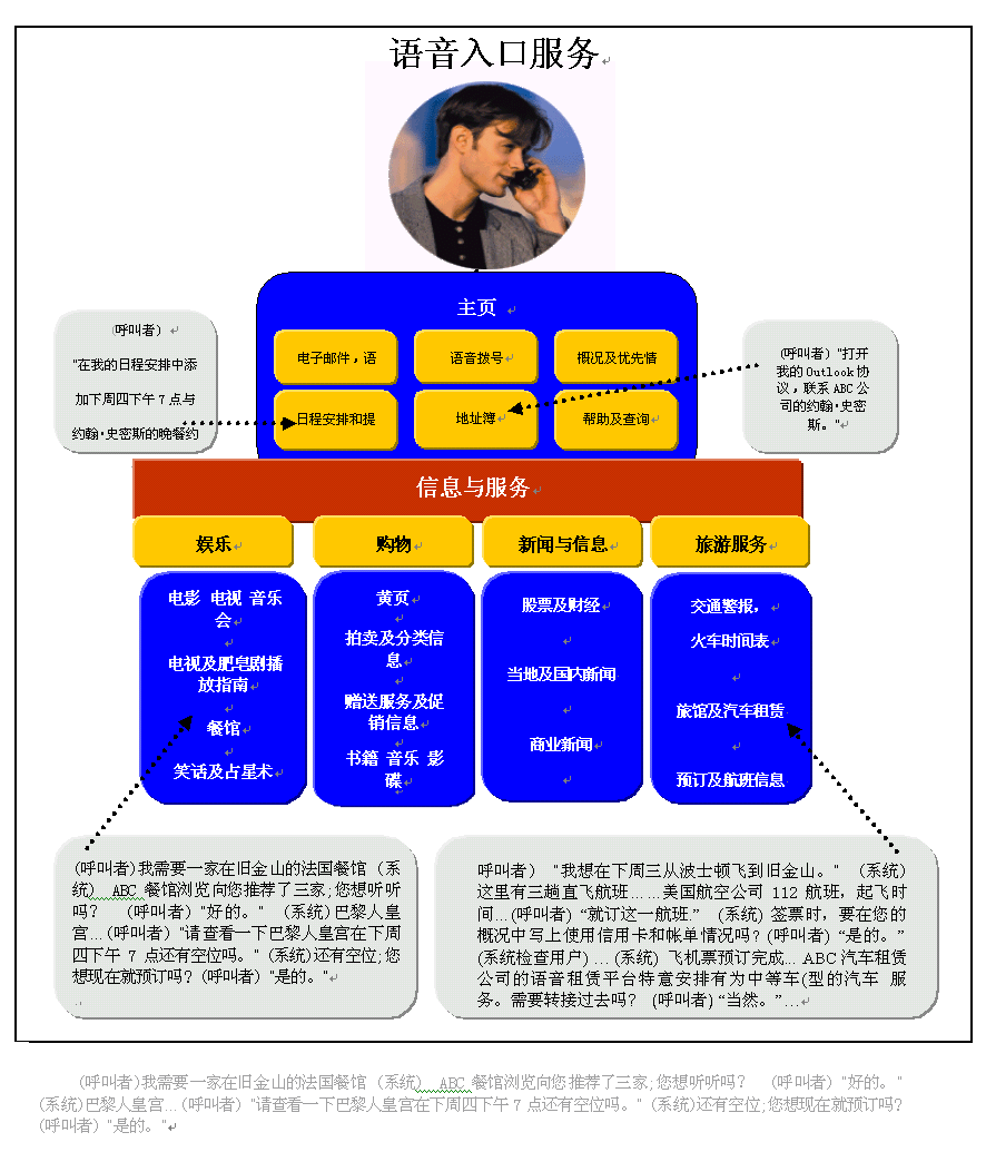 語音網(wǎng)最吸引人之處就在于它可以在一次通話中,同時處理多個任務(wù)。下圖表明一名商務(wù)人員是如何安排好與一個未來的商務(wù)旅行有關(guān)的一系列任務(wù)的。他獲取了對自己有用的信息,順利達(dá)成了一項語音商務(wù)交易,接收個人信息和辦公室的幫助,并撥打電話所有這些都是在一個同步過程中完成的。