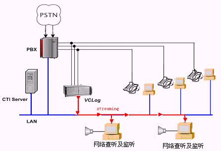 在此項(xiàng)目中,宇高多媒體錄音系統(tǒng)(VCLog)采用時(shí)下最為流行、先進(jìn)的網(wǎng)絡(luò)技術(shù)(流媒體技術(shù)):VCLog網(wǎng)絡(luò)查聽(tīng)及實(shí)時(shí)監(jiān)聽(tīng)錄音功能模塊軟件(VCLog