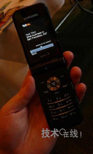 使用Tellme by Mobile檢索店鋪等時(shí)的畫面。首先,用戶可按著通話鍵說出自己所在的町和州的名字。