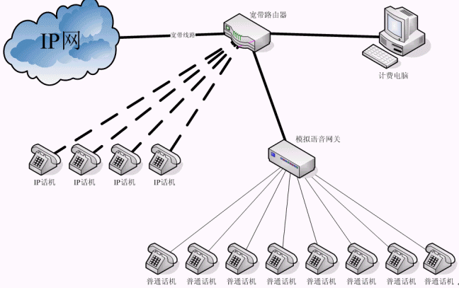 1、 最典型的IP話吧的聯(lián)接方式是寬帶線路連接寬帶路由器,計費電腦和模擬語音網(wǎng)關(guān)連接寬帶路由器,普通話機(jī)連接模擬語音網(wǎng)關(guān),通過計費電腦可以控制模擬語音網(wǎng)關(guān)上的各個話路,其操作包括開機(jī)、停機(jī)、計費和統(tǒng)計話費等。