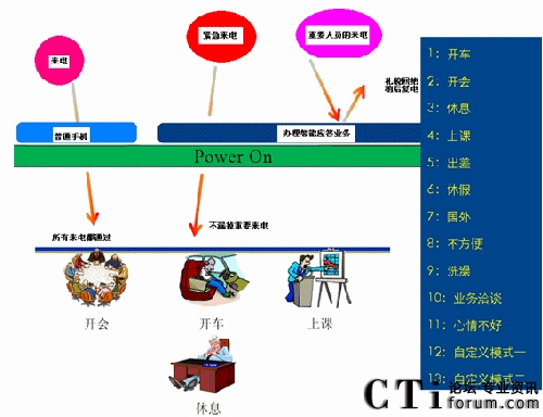 智能應(yīng)答業(yè)務(wù)是針對(duì)消費(fèi)者不便通話時(shí)的一個(gè)增值業(yè)務(wù)。當(dāng)被叫用戶有來(lái)電時(shí),因?yàn)樽约旱脑虿槐阃ㄔ挾鴴鞌嚯娫捄笸ㄟ^(guò)手機(jī)彈出的菜單,供用戶選擇與對(duì)方進(jìn)行的后續(xù)溝通。被叫用戶可以根據(jù)所處的情況選擇對(duì)應(yīng)的情景,系統(tǒng)將根據(jù)用戶選擇的情景對(duì)應(yīng)給主叫用戶發(fā)送短信和放音。智能應(yīng)答業(yè)務(wù)給了我們禮貌拒接的機(jī)會(huì)。當(dāng)您正在會(huì)議室里和客戶如火如荼的策劃下個(gè)項(xiàng)目,當(dāng)然不想被其他人打擾。突然有個(gè)電話打了進(jìn)來(lái),接還是不接,不接有可能是一個(gè)潛在的客戶,接了又是對(duì)目前工作的一種打斷。如果你辦理了智能應(yīng)答業(yè)務(wù),當(dāng)你掛斷電話的同時(shí)手機(jī)上將出現(xiàn)一個(gè)菜單,你可以根據(jù)當(dāng)前具體情況選擇目前所處的情景(開(kāi)車、開(kāi)會(huì)、上課……等)。如你選擇了某種情景,系統(tǒng)將根據(jù)用戶選擇的情景,給主叫用戶播放相應(yīng)的語(yǔ)音通知(如:“您撥叫的用戶正在開(kāi)會(huì),請(qǐng)稍后再撥”)。
