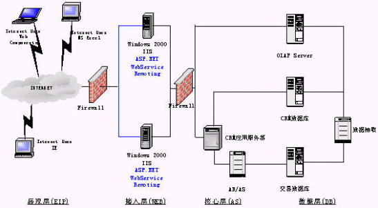展現(xiàn)層實現(xiàn)定制化的、支持各種接入設(shè)備的統(tǒng)一消息平臺是非常必要的,它必將極大地促進(jìn)公司服務(wù)產(chǎn)品的發(fā)展。在展現(xiàn)層我們還強(qiáng)調(diào)企業(yè)信息門戶的建立:信息不是孤立的,需要一個統(tǒng)一的、互動的、個性化的、全面的綜合表現(xiàn)形式,以更方便公司人員對信息的獲取,作出正確的決策。使用ASP.Net和OfficeXP Web Components OLAP展示工具,并能有機(jī)的與辦公自動化工具結(jié)合起來。