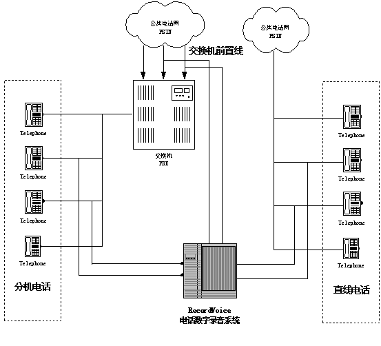 語(yǔ)音卡的模擬線接口和排隊(duì)機(jī)/交換機(jī)的模擬中繼并聯(lián),錄音工作站主要針對(duì)外線話音進(jìn)行錄音。