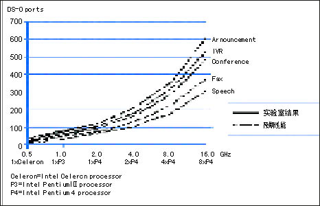 圖1顯示了主要的通信媒體處理功能的實(shí)驗(yàn)測(cè)量結(jié)果和預(yù)期性能。Intel 編制的HMP軟件,在Intel的從566 MHz 到 2 GHz的Celeron和 Pentium 處理器上,已經(jīng)對(duì)語(yǔ)音宣告、IVR和會(huì)議算法完成了實(shí)現(xiàn)、優(yōu)化和測(cè)試。圖1中的實(shí)線(xiàn)表示實(shí)驗(yàn)室中的測(cè)試結(jié)果。Intel的目標(biāo)是實(shí)現(xiàn)這些算法,并擴(kuò)展到更高速的Intel Pentium處理器,雙路、四路、甚至八路Intel Pentium處理器、Intel Xeon處理器以及Intel Itanium處理器。圖1中的虛線(xiàn)顯示了Intel所期望的在未來(lái)的實(shí)現(xiàn)中將得到的結(jié)果。目前,HMP的版本主要以Windows為主,很快就會(huì)推出Linux版本。從根本上說(shuō),HMP最適合用在純IP的環(huán)境,也可通過(guò)擴(kuò)展到多個(gè)服務(wù)器實(shí)現(xiàn)密度的提升。