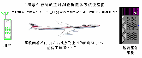 使用"得意"智能航班時刻查詢服務系統(tǒng),用戶可以通過短信/WAP/互聯(lián)網以自然語言的方式與服務系統(tǒng)進行互動,方便地查詢各個航班的時刻,以及相關的信息。當用戶在對話過程中遇到困難時,系統(tǒng)還會主動引導用戶獲取想要的信息,能為乘客和交通機構提供很好的服務手段,實現(xiàn)真正的"智能"。