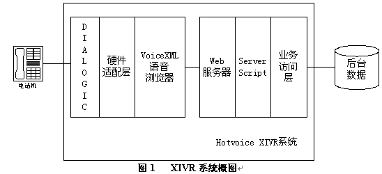 采用Hotvoice XIVR系統(tǒng)實(shí)現(xiàn)的新業(yè)務(wù)可以采用任何Web技術(shù)方便地和原有數(shù)據(jù)系統(tǒng)結(jié)合。用戶可以根據(jù)業(yè)務(wù)需求編寫靜態(tài)voiceXML腳本,或采用ASP/JSP/PHP等動(dòng)態(tài)生成voiceXML腳本;與后臺(tái)數(shù)據(jù)系統(tǒng)間可以采用數(shù)據(jù)庫訪問,或采用XML/HTTP/DCOM或其他協(xié)議訪問。