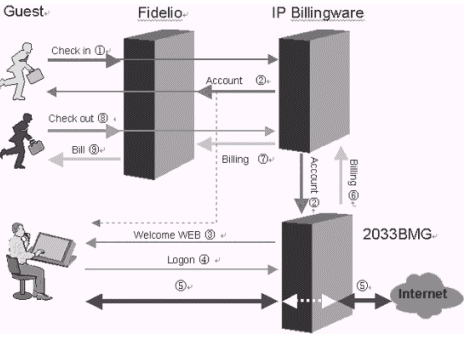 本方案將Dr.COM計(jì)費(fèi)系統(tǒng)作為一個(gè)部件嵌入到酒店現(xiàn)有的管理軟件系統(tǒng)里。這樣做的好處是酒店經(jīng)營者不必面對(duì)兩套系統(tǒng)。