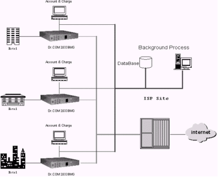 Dr.COM 2033BMG充當(dāng)驗(yàn)證計(jì)費(fèi)服務(wù)器的角色。它接受"前臺(tái)用戶結(jié)算終端"開設(shè)的住客賬戶,在住客撥號(hào)登入時(shí)核對(duì)住客賬號(hào),實(shí)時(shí)地把住客上網(wǎng)的時(shí)間流量等信息返回給"前臺(tái)用戶結(jié)算終端",由后者按預(yù)定的計(jì)費(fèi)策略對(duì)住客收費(fèi)。