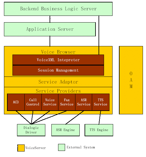 服務(wù)器應(yīng)用于動(dòng)態(tài)腳本。對(duì)于動(dòng)態(tài)腳本,ASP、JSP、PHP等任何用于動(dòng)態(tài)產(chǎn)生HTML腳本的技術(shù)均適用于VoiceXML。對(duì)于動(dòng)態(tài)腳本,應(yīng)用服務(wù)器還負(fù)責(zé)與后臺(tái)業(yè)務(wù)邏輯服務(wù)器接口。