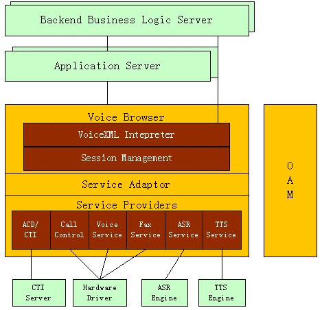 用于存放和產(chǎn)生VoiceXML腳本,可以是文件系統(tǒng)或WEB服務(wù)器,一般文件系統(tǒng)應(yīng)用于靜態(tài)腳本,WEB服務(wù)器應(yīng)用于動態(tài)腳本;應(yīng)用邏輯組件或中間件,進(jìn)行事務(wù)處理。