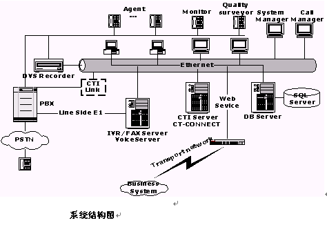 CTI服務(wù)器與PBX相連,接收來(lái)自PBX的事件/狀態(tài)消息,并向PBX發(fā)出命令。CTI服務(wù)器能夠向上提供統(tǒng)一的編程接口,屏蔽PBX與計(jì)算機(jī)間的復(fù)雜通信協(xié)議,給不同的用戶(hù)開(kāi)發(fā)應(yīng)用程序帶來(lái)方便,CTI服務(wù)器與PBX之間采用TCP/IP工業(yè)標(biāo)準(zhǔn)協(xié)議。CTI服務(wù)器在呼叫中心中主要實(shí)現(xiàn)以下功能: 背景資料的屏幕彈出、語(yǔ)音及數(shù)據(jù)的協(xié)調(diào)轉(zhuǎn)移、智能自動(dòng)外撥、智能路由選擇、呼叫功能控制(軟電話(huà))、多方會(huì)議等。